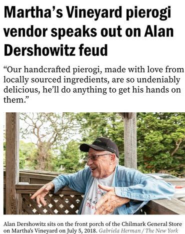 A split-second, in-the-moment conversation between two individuals at a local farmer's market became a viral crisis in August 2025. The co-owners of Good Pierogi were enjoying a typical day at the West Tisbury Farmer's Market when a highly recognizable figure, attorney Alan Dershowitz, visited the vendor's pop up tent and requested a half-dozen pierogi. Given the co-owners' relationships with dozens of sexual abuse survivors, they momentarily questioned whether or not they wished to sell to a man who not only defended, but befriended a number of high profile sexual abusers (Jeffrey Epstein, Roman Polanski, Harvey Weinstein). In that moment, they believed that selling to him would indicate acceptance. While wrestling with their decision, Mr. Dershowitz began harassing and filming the vendor, notably instigating an unnecessary conflict which he proceeded to escalate. In the days that followed, Mr. Dershowitz distributed defamatory flyers around the market about the vendor. He further opined that the vendor chose not to sell to him based on religious grounds--a patently false and fabricated narrative he shared broadly on his platforms and through media interviews.